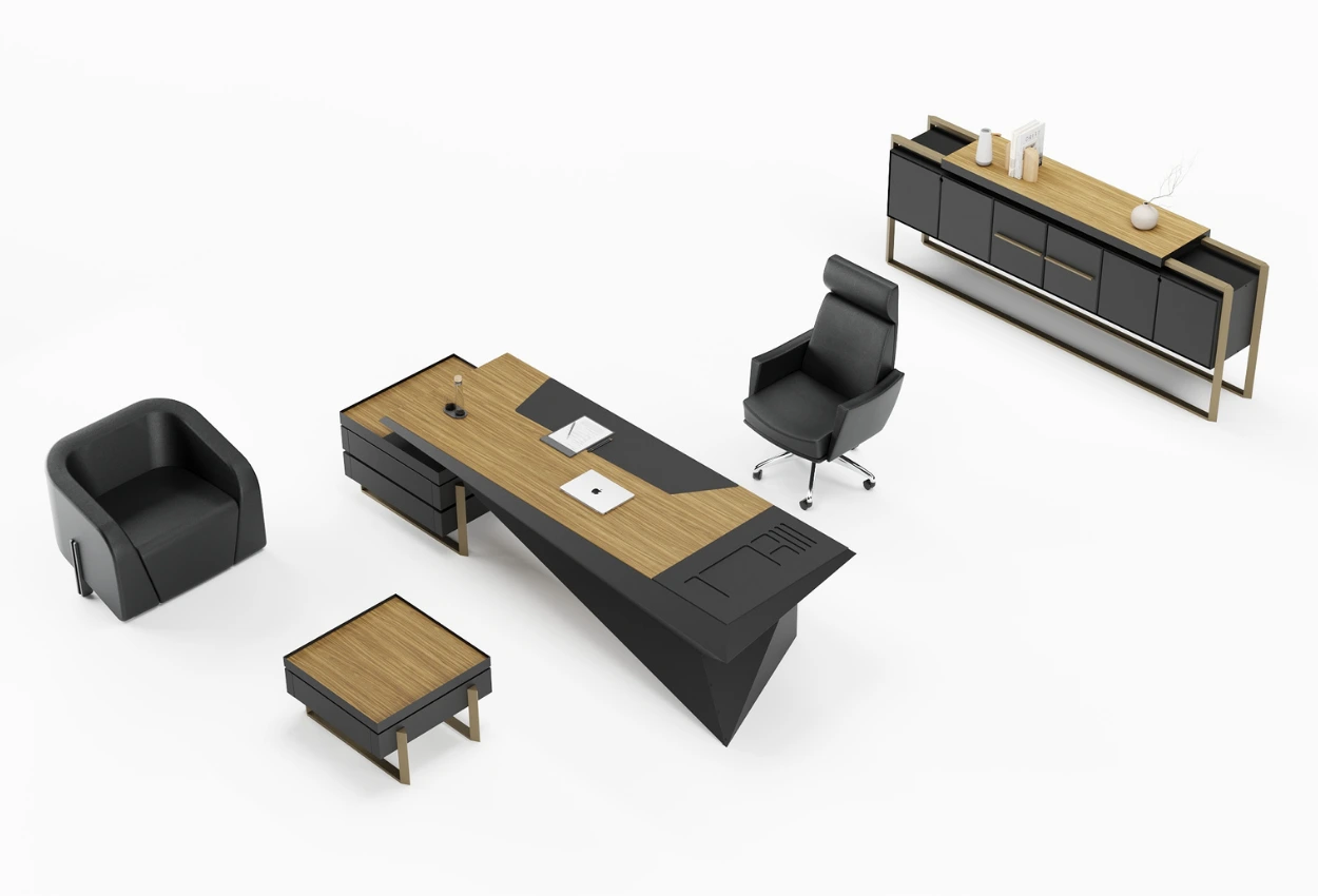 Mimari bir heykel gibi… CLON, keskin hatları ve üçgen formuyla güçlü bir duruş sergilerken, siyah ve ahşap tonlarının dengesiyle modern bir ofis kimliği sunar. Sanatsal bir cesaretin simgesi olan bu takım, liderliğe estetik bir yorum katar.